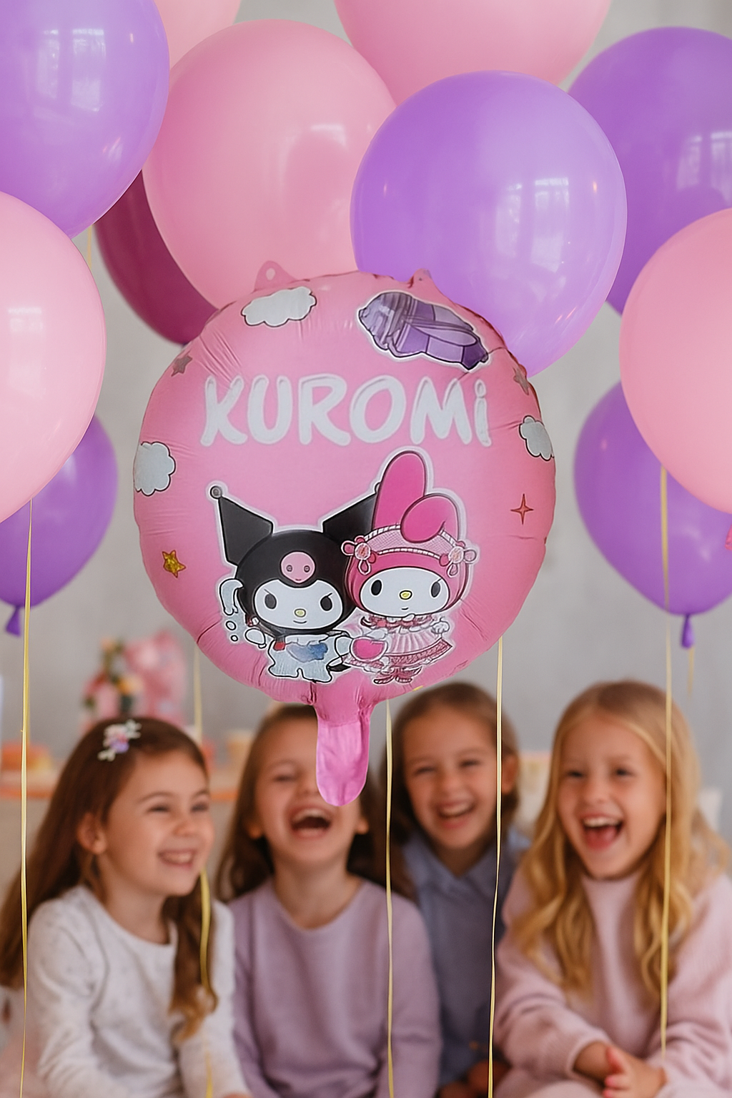 Pembe zemin üzerinde sevimli Kuromi baskısıyla fotoğraf köşelerinde net görünürlük sağlayan 45 cm yuvarlak folyo balon. Doğum günü ve konsept partilerde tek parçada şık ve dayanıklı bir dekor etkisi sunar.