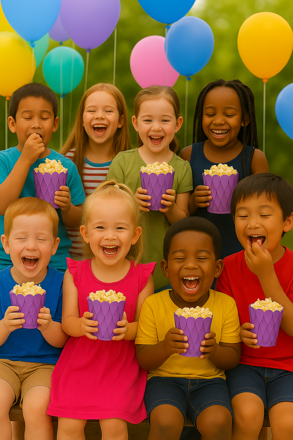 Tek ve Vurucu Kombin (yalnız bu ürün için): Mor masa örtüsü + şeffaf kapaklı içecekler; kutuları üçgen dizip ortada büyük mısır kasesiyle odak oluşturun.