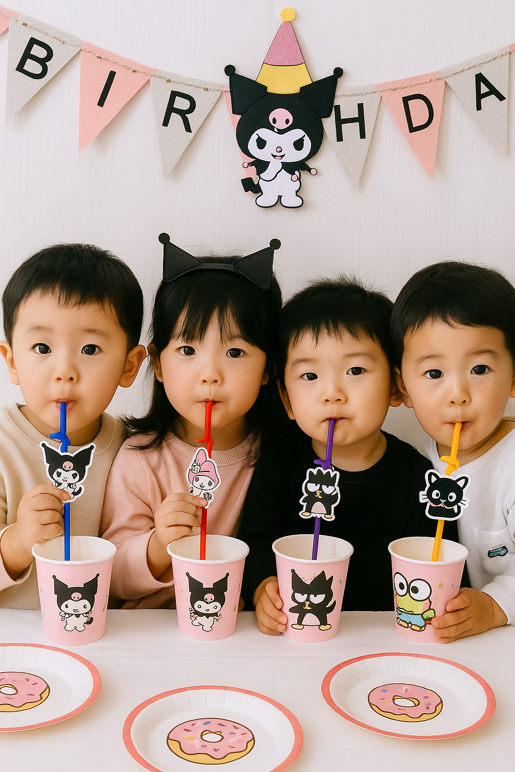 Soğuk içecekleri Kuromi temalı artistik pipetlerle tek hamlede parti havasına taşıyın. Körüklü (bükülebilir) boyun rahat içim sağlar; canlı baskılı dekor kartları çocukların favorisi olur. Gıda ile temasa uygun malzemeden üretilmiştir; doğum günü, okul etkinliği ve temalı partiler için hijyenik ve pratiktir.